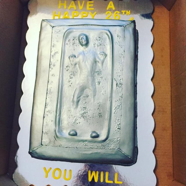 First surprise for my birthday: this incredible @starwars Han Solo Frozen Carbonite cake from Cherry Baby’s Sweets and Treats. Thanks for the best birthday cake I’ve ever had @krisonrequest and @alymarieavina 🎂😃